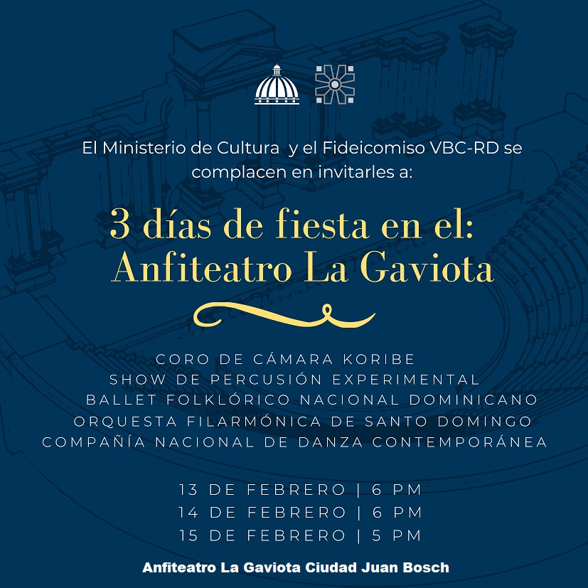 La inauguración del Anfiteatro La Gaviota se extenderá durante cuatro días, desde el jueves 12 hasta el domingo 15 de febrero, con una programación artística de alto nivel, coordinada junto al Ministerio de Cultura, que convertirá este nuevo espacio en el epicentro cultural de Ciudad Juan Bosch.