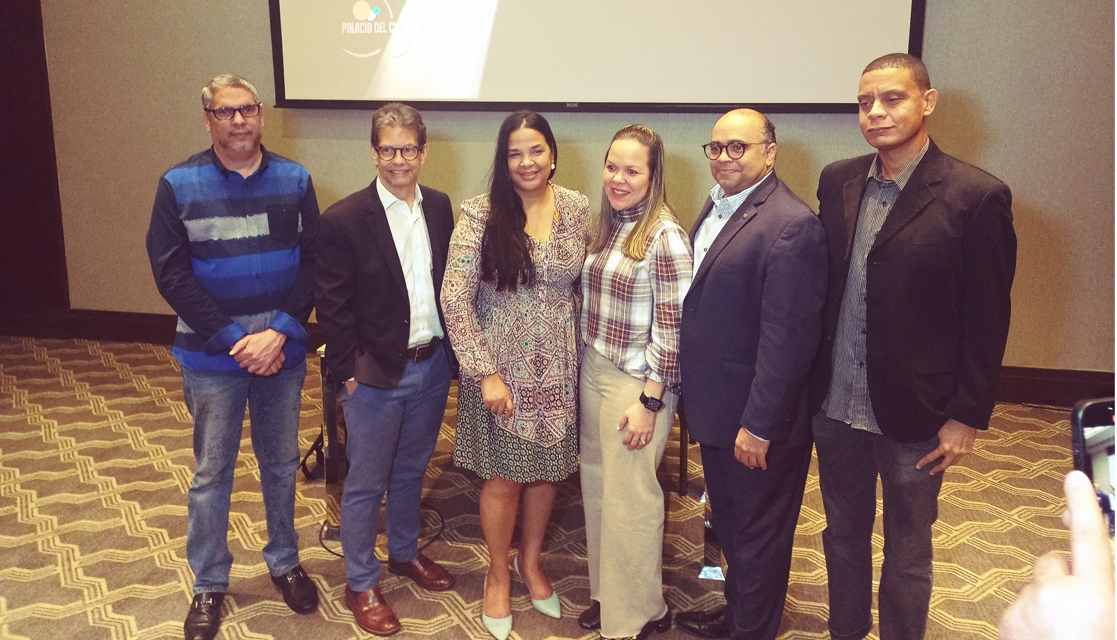 Directivos del Festival de Cine Global Santo Domingo 2022 posan para los medios en el encuentro de prensa en que se ofrecieron los detalles del primer gran festival dominicano de este año.