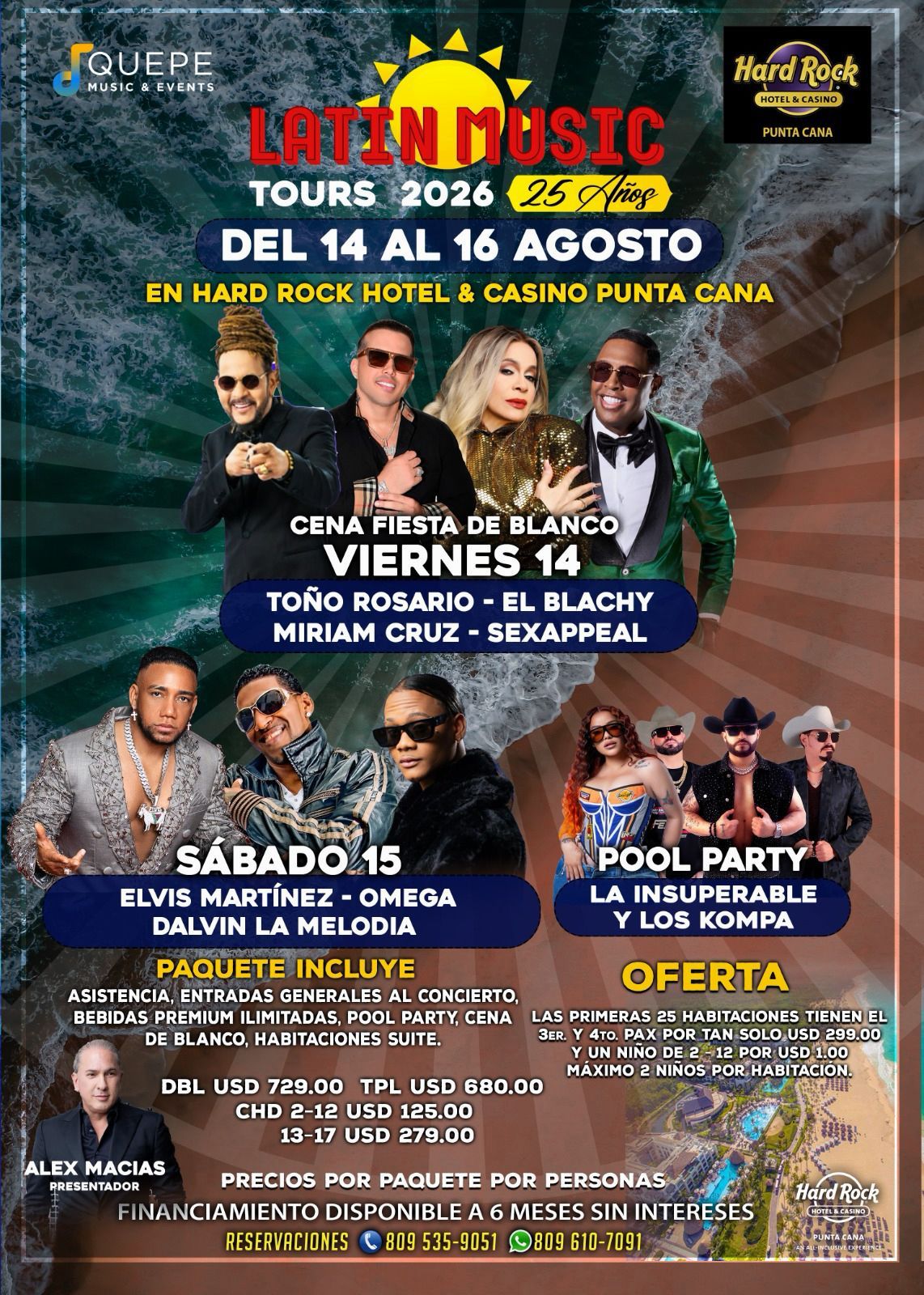 “El viernes 14 de agosto vamos a tener un desayuno con una bendición, y en la noche una cena de blanco en el Salón Filmore de Hard Rock Hotel & Casino Punta Cana , previo a los conciertos bailables de Miriam Cruz, Toño Rosario, El Blachy y Sexappeal. Este último también está celebrando 25 años en la música”, informó Quezada.