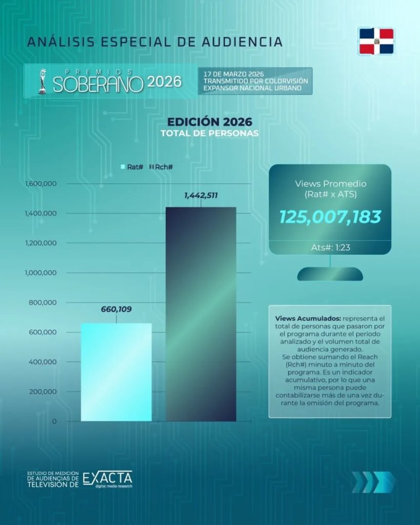 Santo Domingo, R.D.– La más reciente edición de Premios Soberano 2026 volvió a demostrar su liderazgo como el evento artístico más importante de la República Dominicana, al congregar a más de 1.4 millones de personas frente a la pantalla de Color Visión, consolidando un nuevo récord de audiencia a nivel nacional.