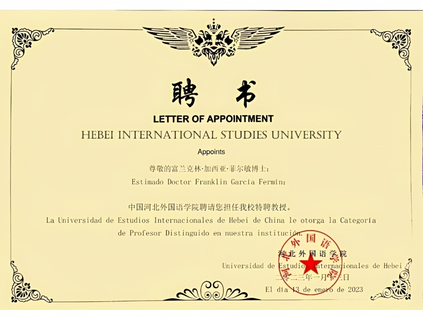 SANTO DOMINGO. – La prestigiosa Universidad de Estudios Internacionales de Hebei, en la República Popular China, otorgó el título como Profesores Distinguidos, al ministro de Educación Superior, Ciencia y Tecnología, doctor Franklin García Fermín, y a la viceministra Carmen Evarista Matías, por sus aportes a la educación superior dominicana, durante un encuentro en la modalidad online entre ese Ministerio y las autoridades académicas de la nación asiática.